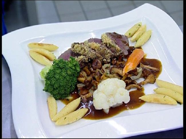 Hirschrücken unter der Rosmarinkruste an einem Spargelragout mit Schupfnudeln