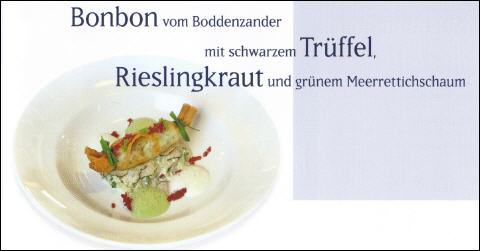 Den Spitzkohl in sehr dünne Streifen schneiden und mit feinen Schalotten-würfelchen in der Hälfte der Butter anschwitzen. Mit dem Riesling auffüllen, gar schmoren und mit Salz und Pfeffer abschmecken. Den sauberen, von der Haut gezogenen Zander in vier gleich große Stücke schneiden. Den Zander mit drei dünnen Trüffelscheiben bedecken. Jetzt den Zander mit Salz und Pfeffer würzen, in den Strudelteig einwickeln und diesen mit dem Eiklar verschließen. Beide Enden des „Bonbons"